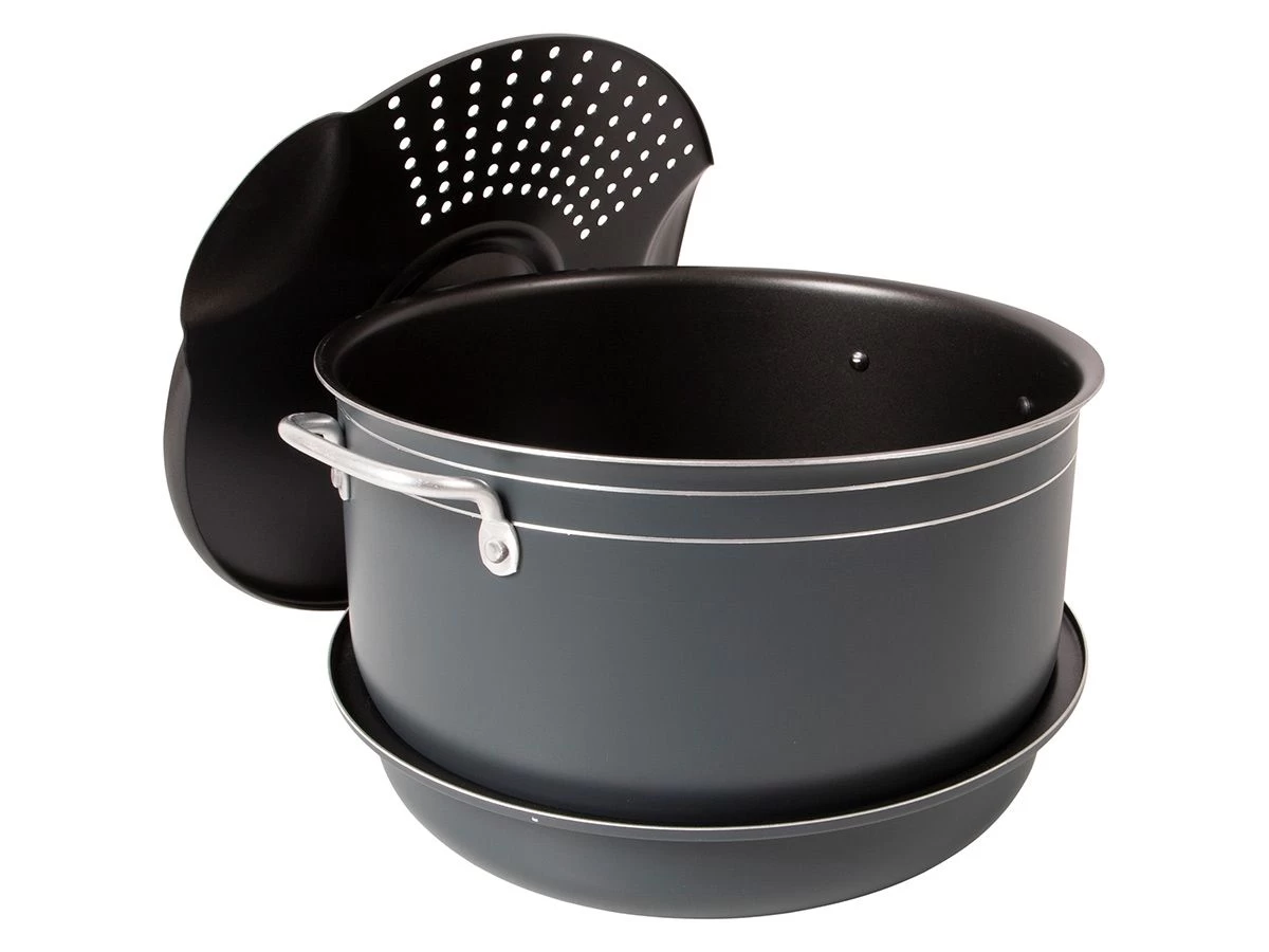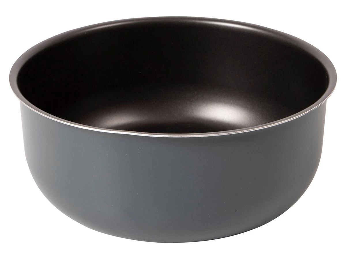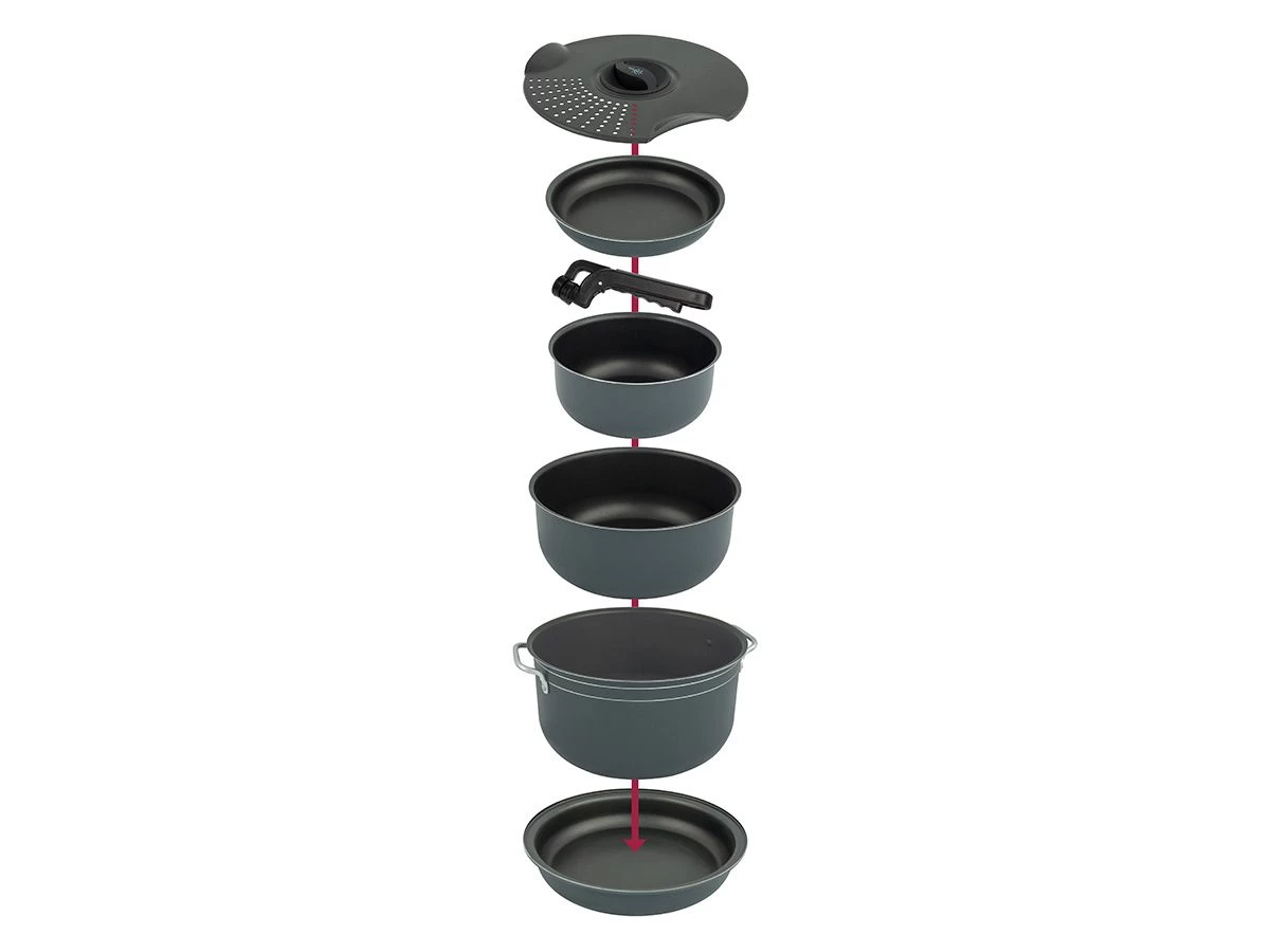 Deze lichtgewicht pannenset van Bo-Camp bestaat uit 3 kookpannen, 2 koekenpannen, 1 deksel en 1 pannengreep. De aluminium pannen zijn voorzien van een poedercoating aan de buitenzijde en een anti-aanbak coating aan de binnenzijde.