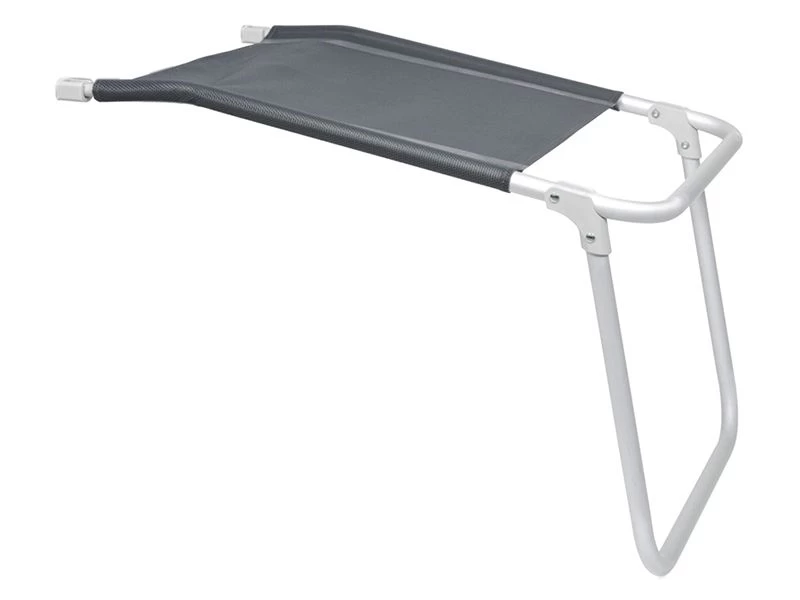 Het frame is gemaakt van aluminium en met daarop een textileen bekleding. De voetensteun is na gebruik plat in te klappen zodat hij eenvoudig vervoerd en bewaard kan worden.