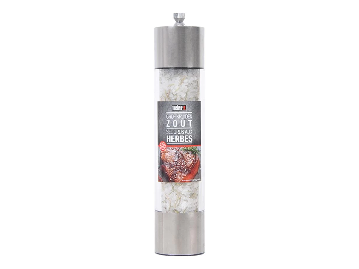 Het Weber grof kruidenzout zit in een handige navulbare kruidenmolen.